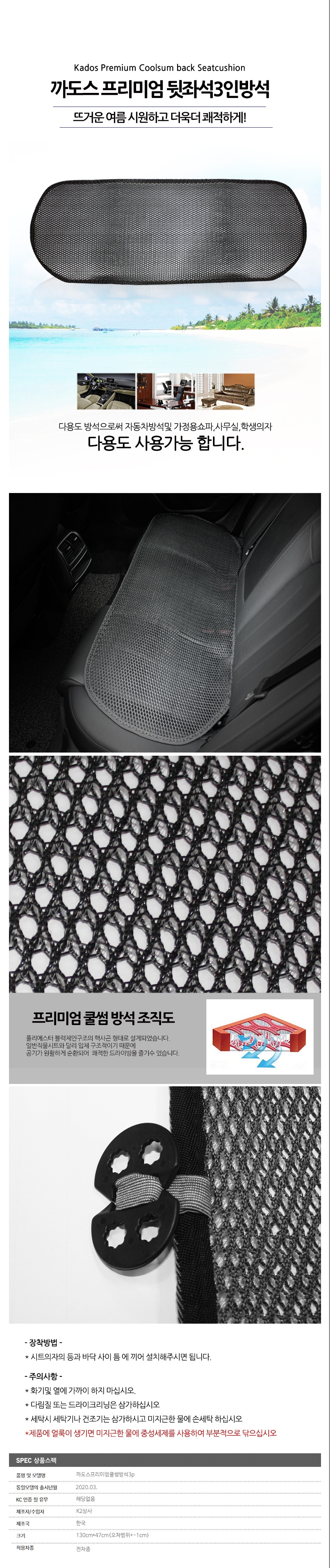 전차종사용 쿨썸 자동차 통풍방석 뒷자석 3인용