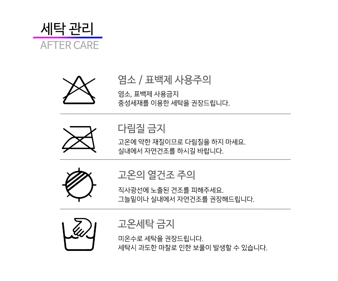 6. 세탁방법 및 취급시 주의사항 : .미지근한 물에서 중성세제를 사용하여 단독 손세탁하세요. 물에 오래 담구거나 섬유유연제, 표백제의 사용을 삼가하세요. 비틀어 짜거나 다림질할 경우 변형될 수도 있습니다,